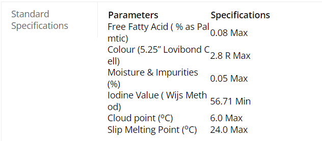 RBD palm oil is obtained from refining crude palm oil. It is a light yellow liquid and semi-solid at room temperature, melting to a clear yellow liquid on slight heating.