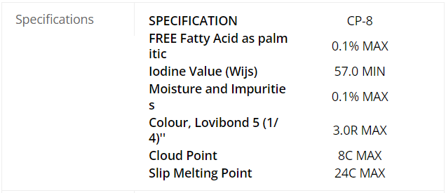 Palm olein is the liquid fraction obtained by fractionation of palm oil after crystallization at controlled temperatures. The physical characteristics of palm olein differ from those of palm oil. It is fully liquid in warm climate and has a narrow range of glycerides.